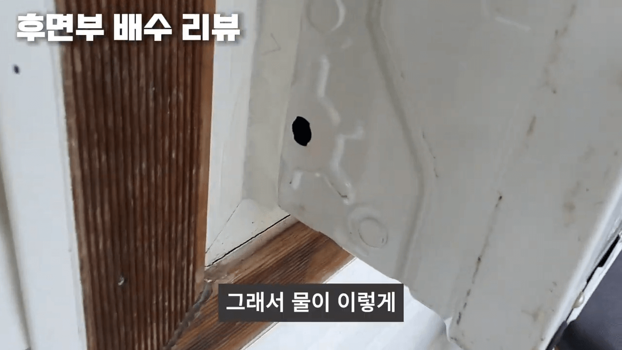 제품 아래쪽에는 습기가 모인 물이 나오는 배수구멍이 있는데요. 원래는 제품에 포함된 플라스틱 호스를 연결하도록 되어 있는데 저는 지인한테 받지를 못해서 구멍이 있는 채로 그냥 설치했습니다.