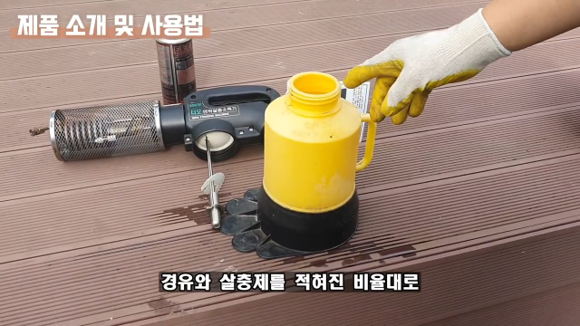 사용할 때는 먼저 경유와 살충제를 적혀진 비율대로 넣어주시고요.(제품마다 혼합비율이 다른데 이 제품은 경유 100에 살충제 1 비율입니다)